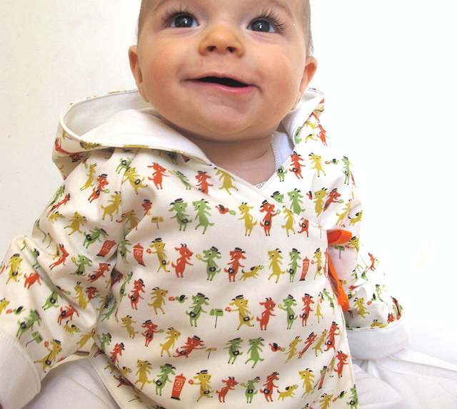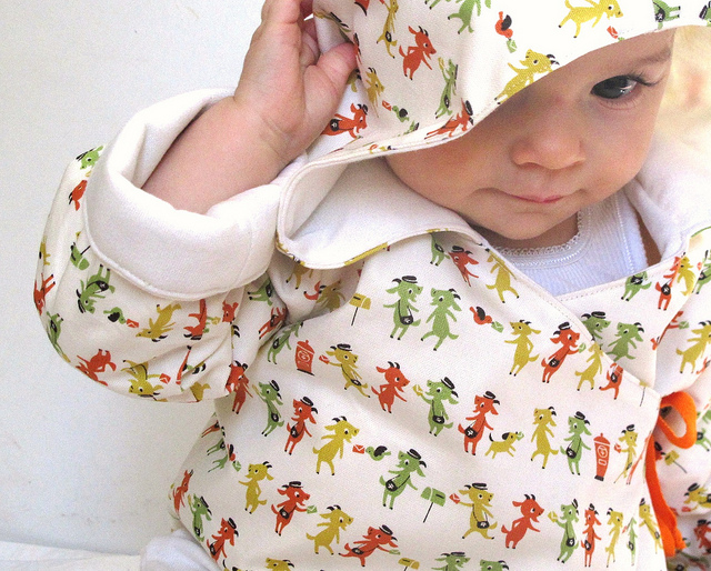 1T is the smallest size in this pattern and kind of works for a 7 month old (albeit a large one) with the sleeves rolled up. The only thing I couldn’t figure out was why this pattern has a one-size-fits-all hood? It echos in there. Still, I love this kokka postie goats fabric and am quite chuffed with how it turned out.