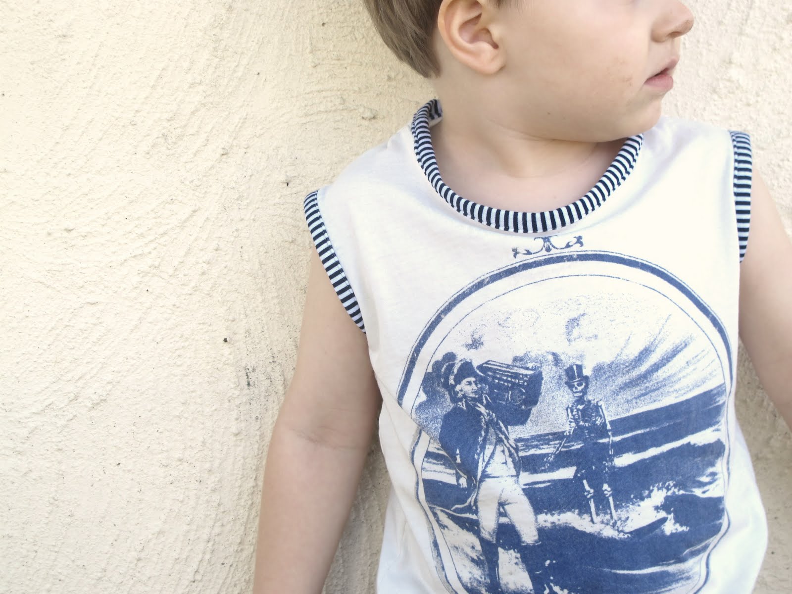 I’ve been eyeing off this men’s surfie tee and awaiting its hand-me-down, knowing it would make the perfect little boy’s summer singlet. I’ve never made a singlet before and it was much the same as constructing a shirt pattern from an already existing one. The contrasting ribbing is a stripey knit fabric and I think I will coin this creation a nautical ensemble with a hint of pirate.