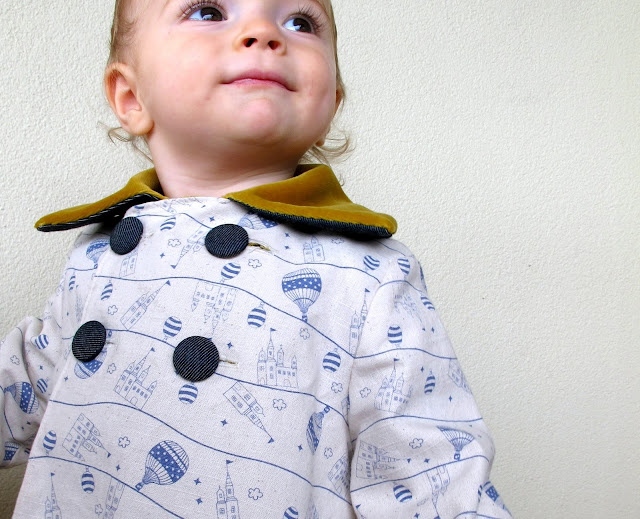 The velour was the one piece out of a great lot of thrifted fabrics that I brought home and thought, ‘it’s hideous…what was I thinking?!’ And then I remembered this beautiful version of the Pea Coat. I used some dark denim from the same thrifty pillage for a contrast under the collar, sleeve tabs and the self cover buttons. I was planning to take some width out of the coat so it’s a tad more up and down for a boy and forgot…does it look like a dress?