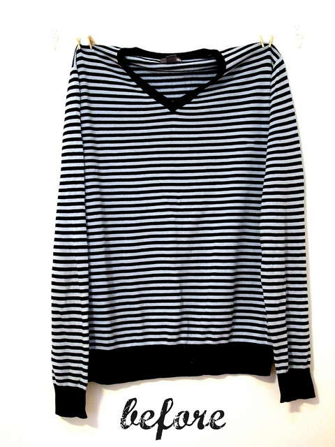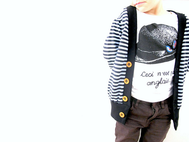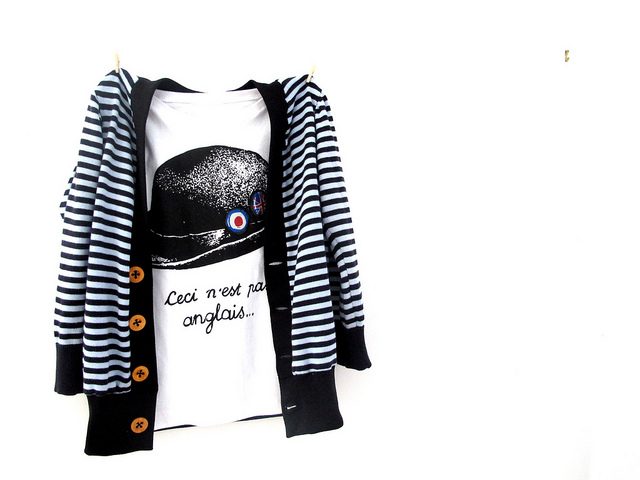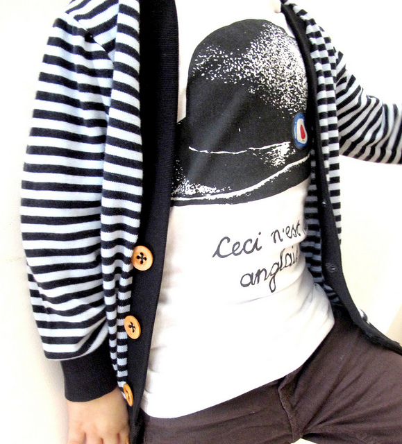 Last week Mexico, this week we’re feeling frenchy with stripes and little wooden buttons. I love this fabric, the label on the sweater says cotton but it feels like really soft wool. I’m not sure how to explain it lusciousness. Since it began as an adult sized sweater, I really should have re-fashioned it into a cardigan for me! The under shirt is also a men’s tee re-fashion. I didn’t use a pattern for the shirt, but chopped up one of Archie’s size 4 shirts into all the parts: sleeves, front, back and neck ribbing. From there it was as simple as tracing the parts onto the men’s shirt and hijacking the ribbing too, which saves effort. Go the hack job!
