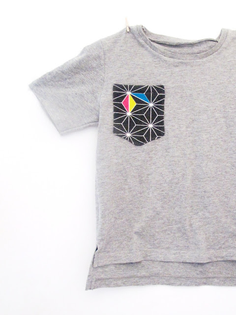 For this one I wanted to make a plain tee with a party on the pocket. The geometric fabric is from a thrifted sweater, also seen here on these pants. And the grey is another daddy shirt. My favourite thing about using old tees to make a new tees is the time you save by not hemming by lining up the pattern pieces so they sit over the already hemmed parts of the tee. I did this with both the sleeves and the hem on both tees and so they took under an hour each. I have plans to a whole heap more, they’re just so fun!