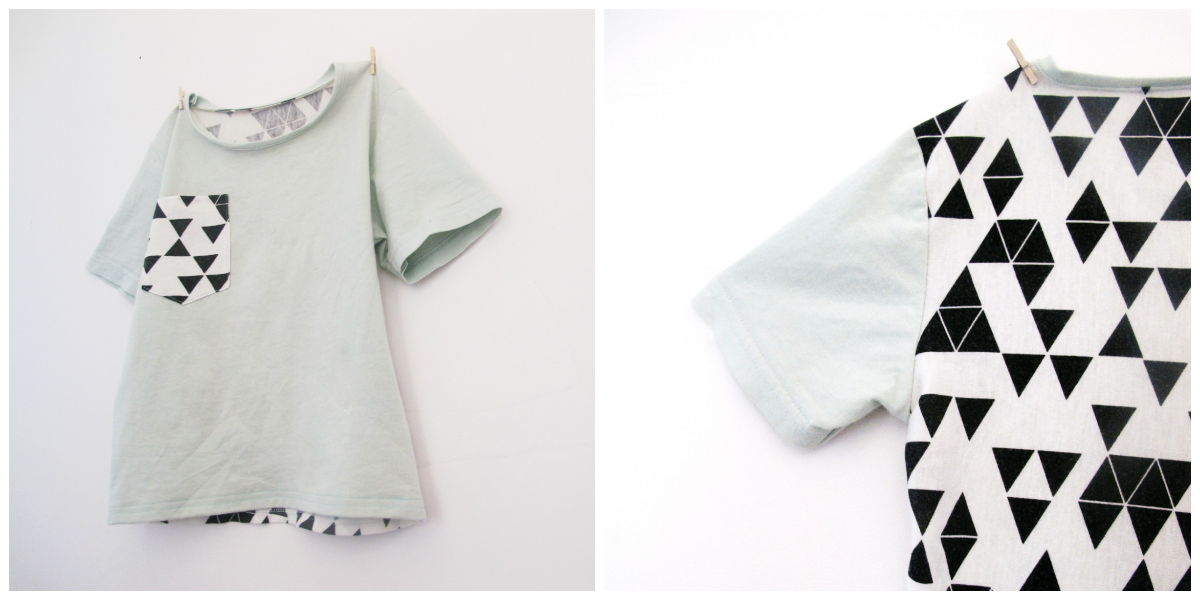 The Banyan T-shirt has lots of possibilities for personalizing. You can make it as subtle or loud as you like, whatever your boy style may be. The little pocket on the front is a nice feature and I also like that the neckline binding can be made out of the same fabric as the body of the tee, rather than ribbing. Here I’ve used a handed down spearmint t-shirt of daddy’s and a re-tired el-cheapo dress of mine, that was $5 new and really too small but I bought it anyway for obvious geometric fantasticness.