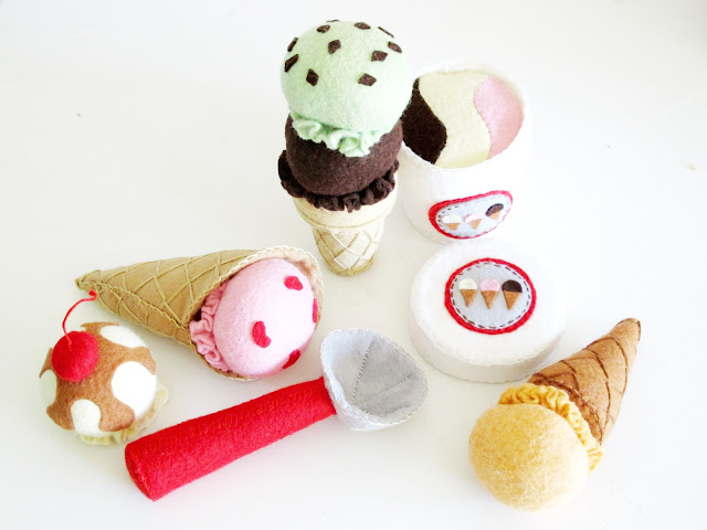 Now just putting it out there there. In the DIY gift arena, you would be hard pressed to find anything cooler than an entirely felt ice-cream parlor? As well as being pretty to look at, it’s a tactile wonderland. The ice-cream scoops and cones are detachable with velcro which means you can have your chocolate mud-cake in a waffle. Or your peppermint chock chip in a cake cone. Or a strawberry chunk surprise (with real strawberries), orange sherbet and caramel triple scoop. Lets not forget the cherry. Kids or no kids, I would probably still have made and gifted this to myself.