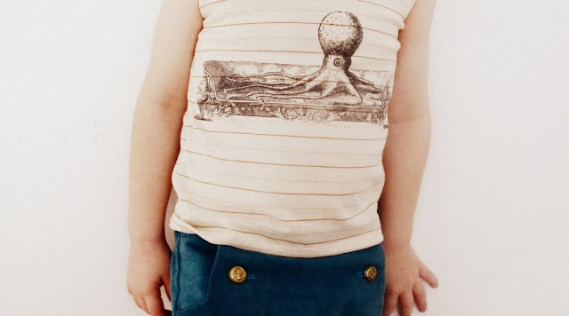 I’m down to the last of what’s been a really great pile of thrifted fabric and having used up most of the bright stuff, am left a muted palette, like these two. It’s kind of refreshing. Maybe it’s the weather getting cooler. Another thing in favor of a good basic like the flashback tee is the fun you can have with mods. Sleeves or no sleeves, patterned or plain, embellished, colour blocked, ribbing or no ribbing. Instead of using regular ribbing for arm and neck bands, I wanted the same fabric as the shirt for the squid one and a contrast stripey knit fabric for the other. Since neither of these knit fabrics are as stretchy as ribbing, the length of the bands are only 1/2 ” shorter than the arm and neck hole measurement instead of the recommended 1″ and it seems to work well. I couldn’t love these any more. Oh, and good news…one just came out of the washing machine with the image intact!