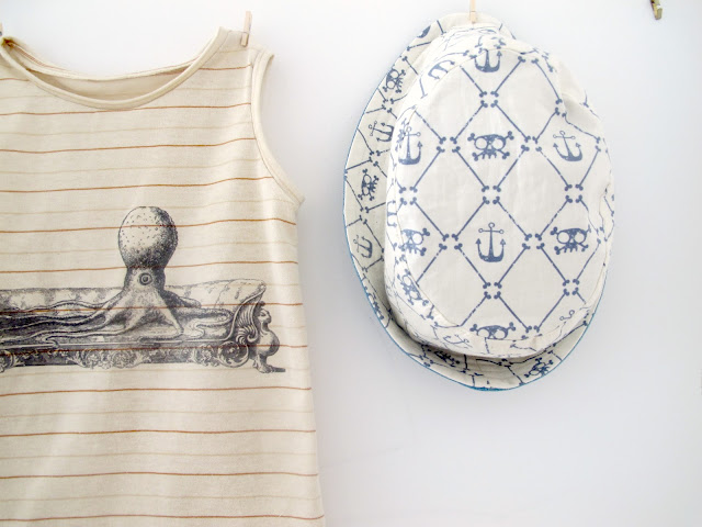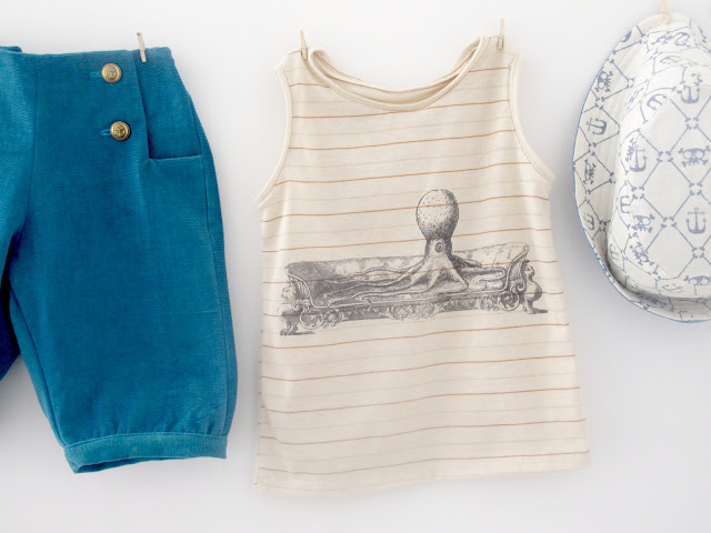 After the great success of ‘man with antlers’ tee for Vintage May I’ve been itching to make more transfer tees using Leslie Rylie’s unbelievably amazing artist transfer paper. I’ve stocked up on fantastic vintage images like squids on a sofa and a steampunk airship from here. Addicted? Just a little. And Rae’s flashback tee makes the perfect canvas. I should probably be starting to leave sleeves on things but have been swept up in summer singlet action…first inspired by Kristin’s vintage strongman, then Inder’s stripey version and I’m loving the colours and style of Jessica’s singlet here. Kristin’s has a very helpful how-to for modifying the flashback tee to a singlet, which is not just a matter of shearing the sleeves straight off as I would have probably done.