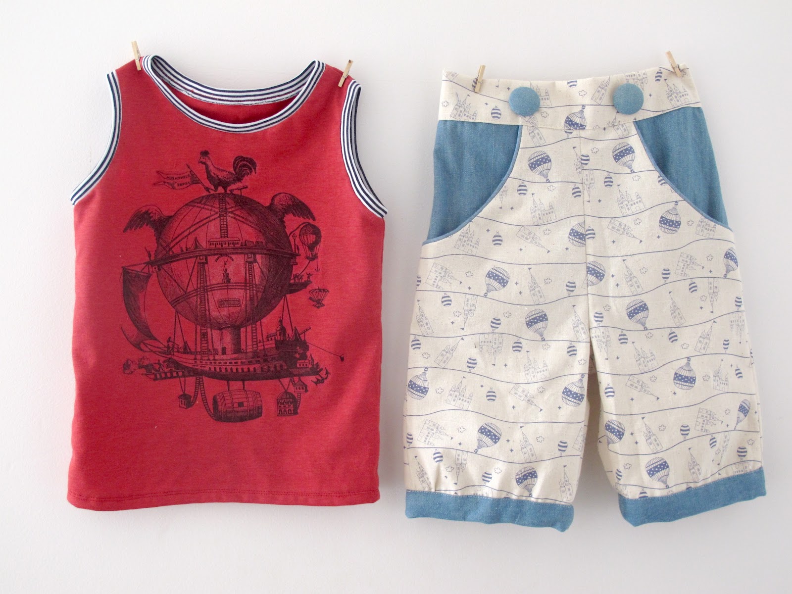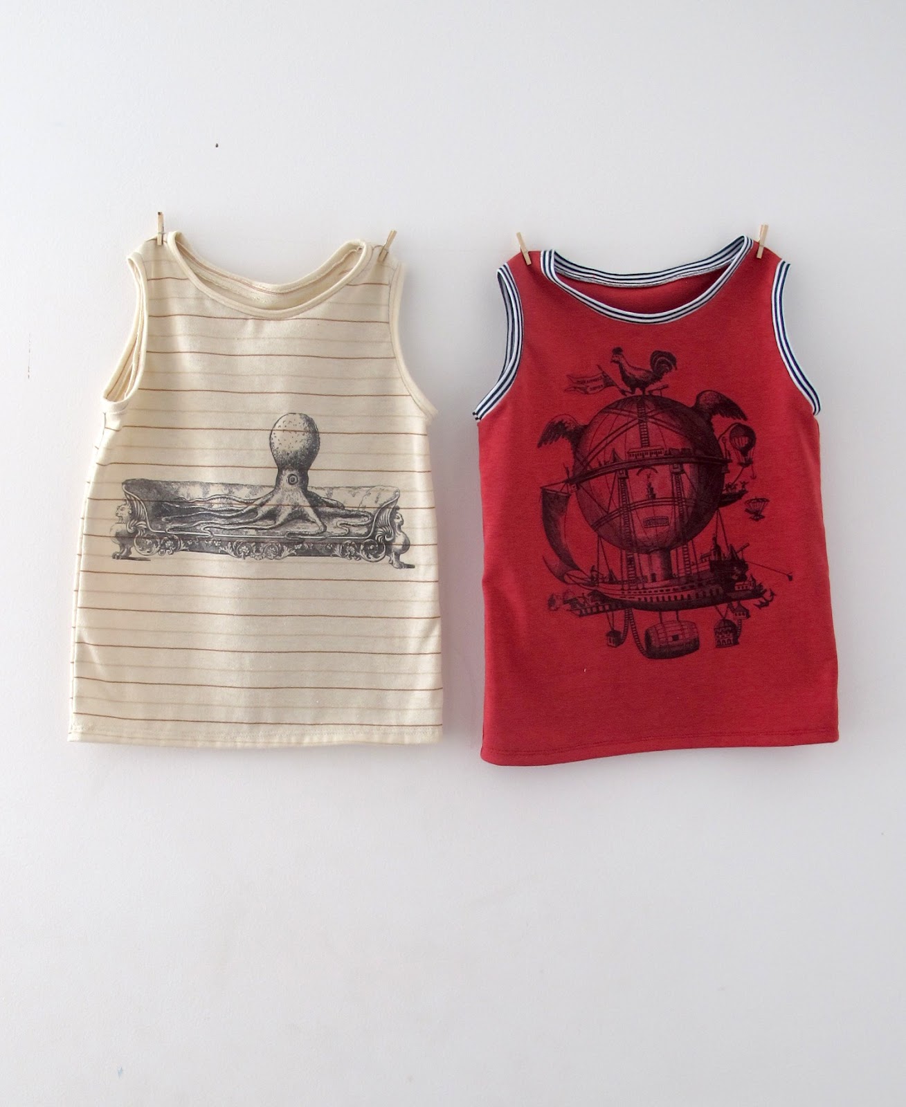 After the great success of ‘man with antlers’ tee for Vintage May I’ve been itching to make more transfer tees using Leslie Rylie’s unbelievably amazing artist transfer paper. I’ve stocked up on fantastic vintage images like squids on a sofa and a steampunk airship from here. Addicted? Just a little. And Rae’s flashback tee makes the perfect canvas. I should probably be starting to leave sleeves on things but have been swept up in summer singlet action…first inspired by Kristin’s vintage strongman, then Inder’s stripey version and I’m loving the colours and style of Jessica’s singlet here. Kristin’s has a very helpful how-to for modifying the flashback tee to a singlet, which is not just a matter of shearing the sleeves straight off as I would have probably done.